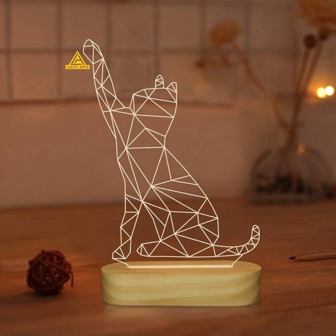 Flat acrylic panel laser-engraved to create a glowing 3D cat shape when lit.