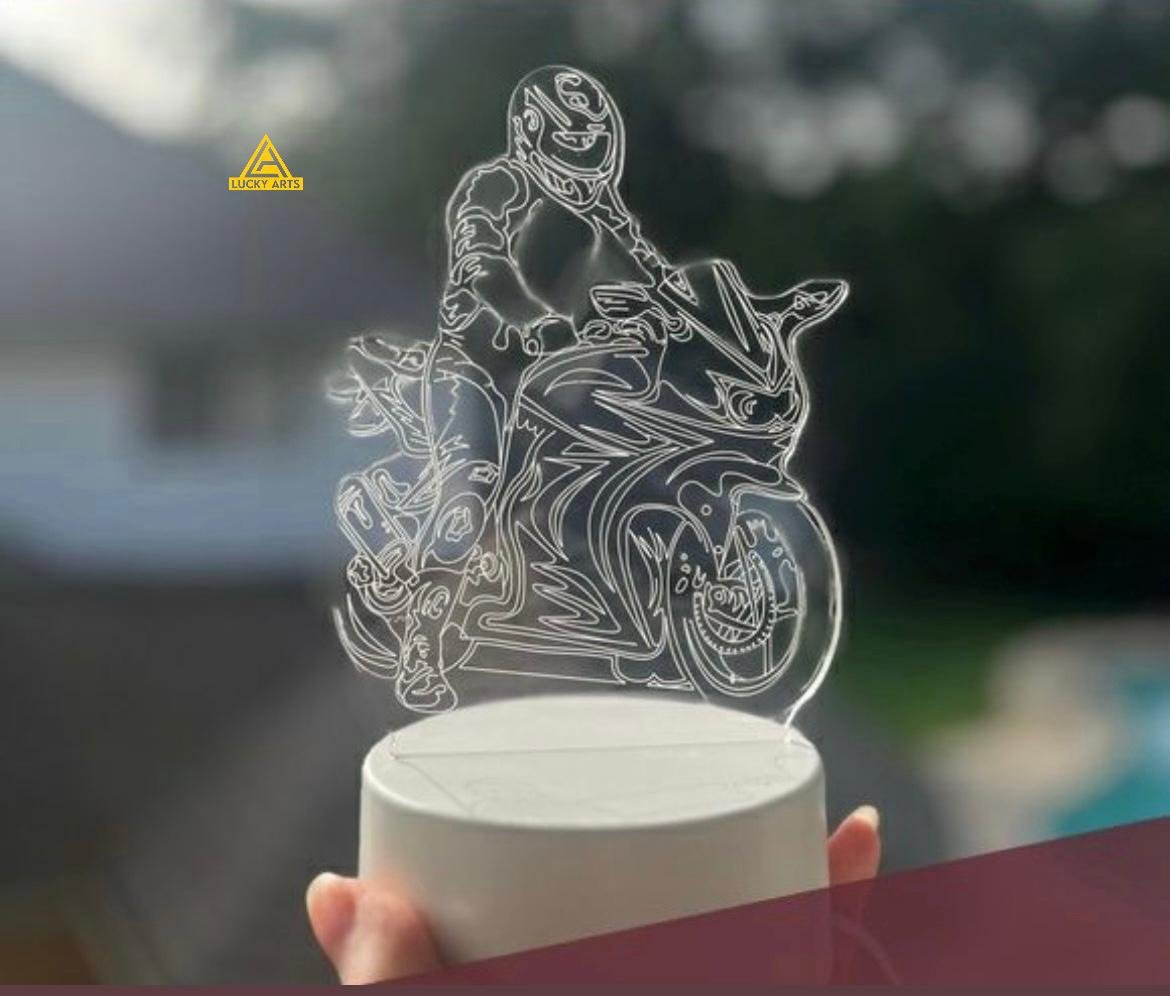 Fuel your passion for speed and power with this dynamic 3D H2R Bike with Rider Illusion Lamp. Designed using precise laser-engraving on a flat acrylic panel, this lamp lights up to reveal a striking 3D illusion of the Kawasaki H2R superbike with a rider in motion — a must-have showpiece for motorbike lovers and thrill seekers.