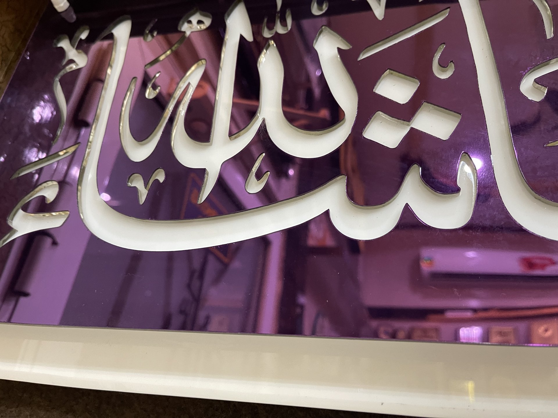 Illuminate your space with the serene beauty of our MashAllah LED Light 2D Wall Frame from Lucky Arts. Crafted with an acrylic base and adorned with a mirror acrylic ‘MashAllah’ inscription, this elegant frame is enhanced with LED lighting to create a mesmerizing glow. Mounted with spacers, this piece adds depth and dimension to any room, making it a perfect addition to your decor.