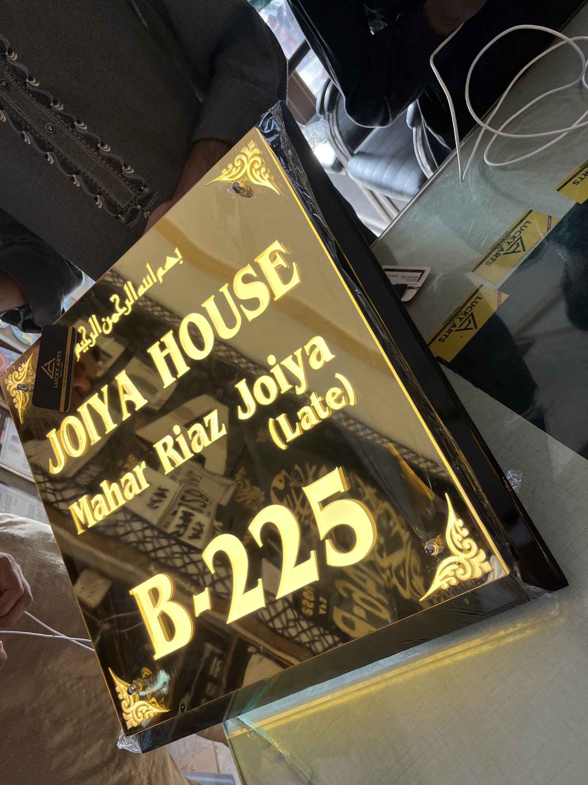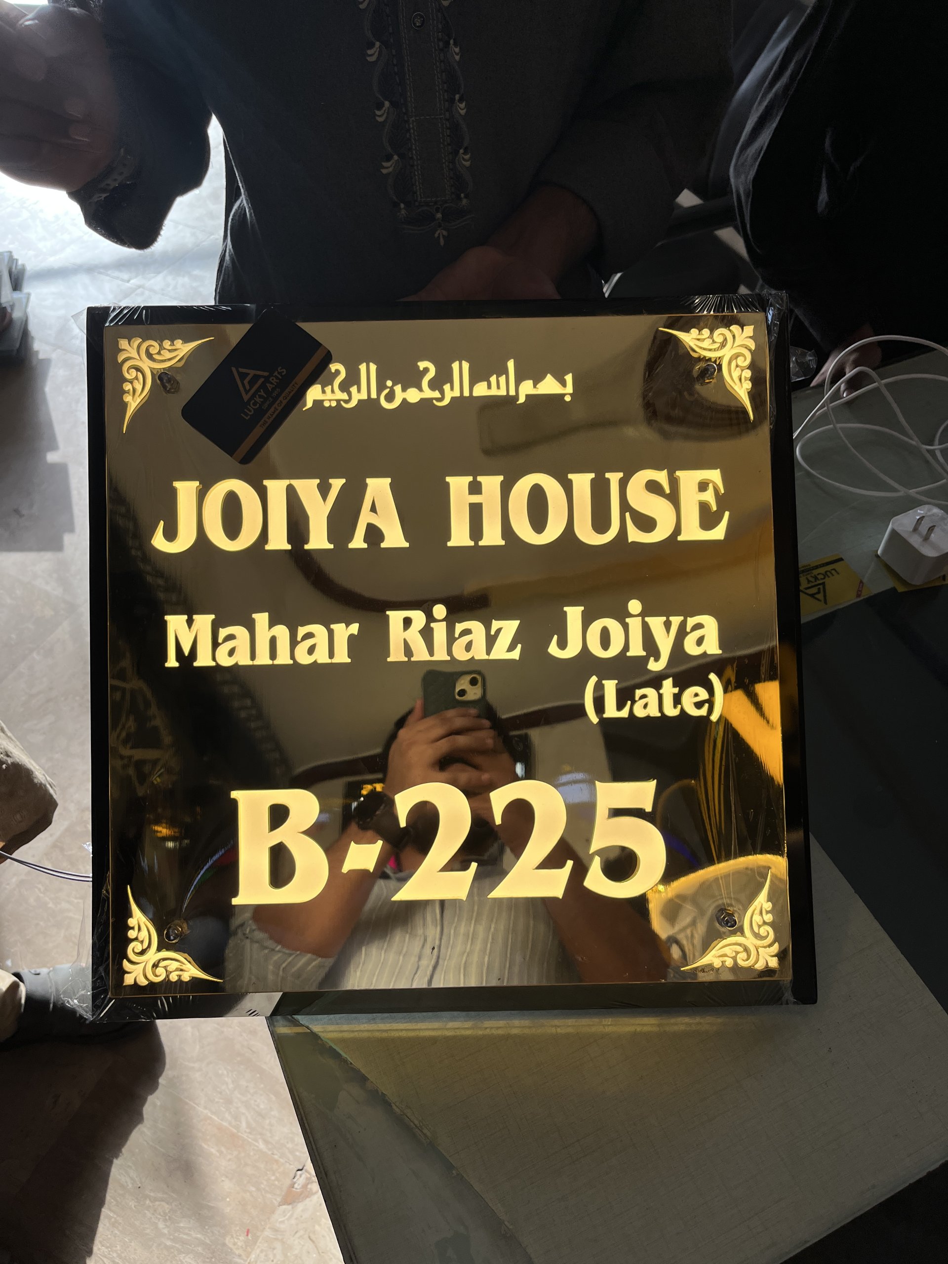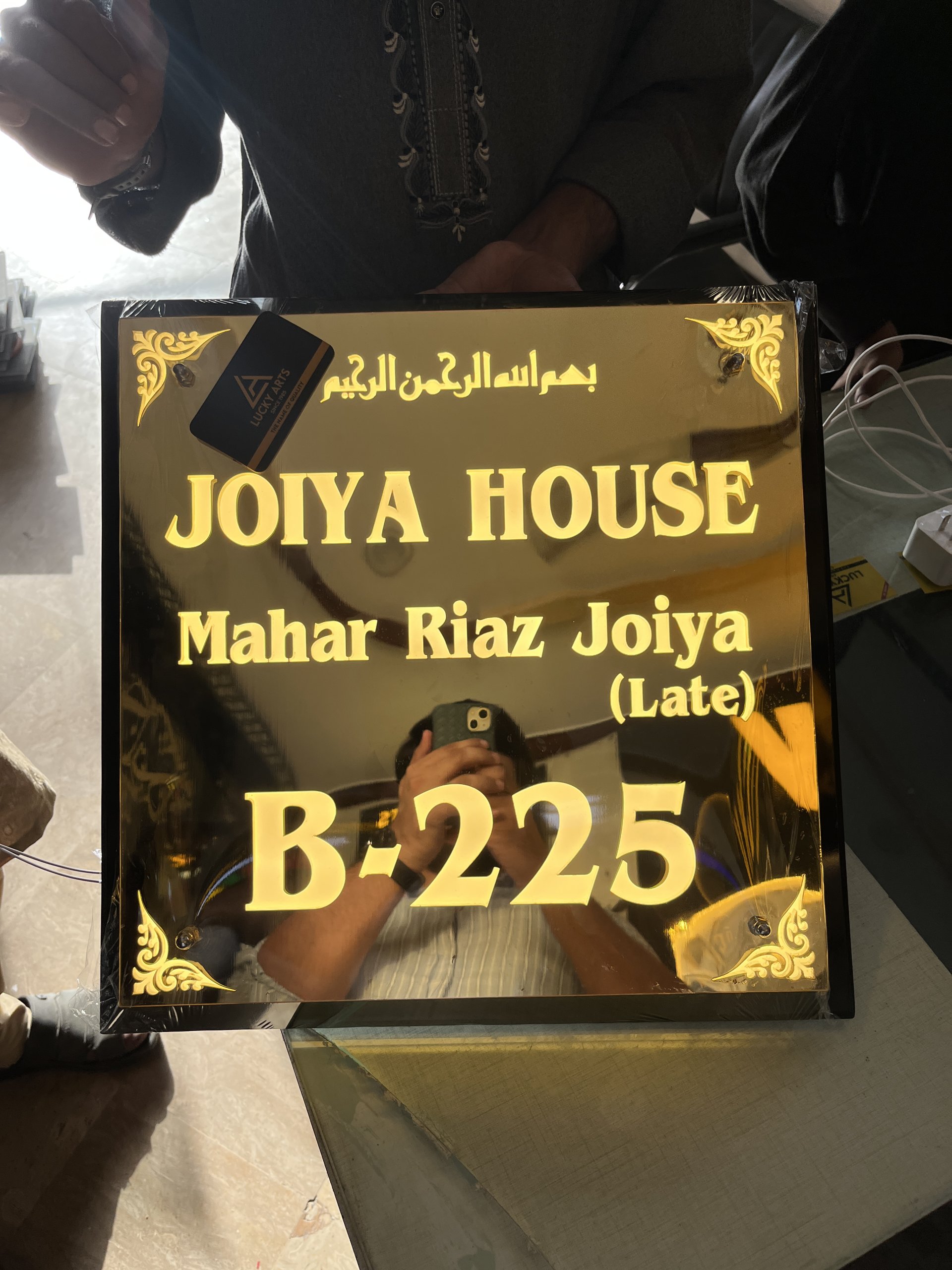 Enhance your entrance with the luxurious and radiant appeal of our “Bright Your Entrance with Lights Elegance Personalized House Name Plate” from Lucky Arts. Made with high-quality black and mirror golden acrylic in a sophisticated double-tone design, this name plate is both durable and visually stunning. Equipped with waterproof LED lights, it ensures your home’s name and number stand out brilliantly, creating a warm and inviting glow for visitors.