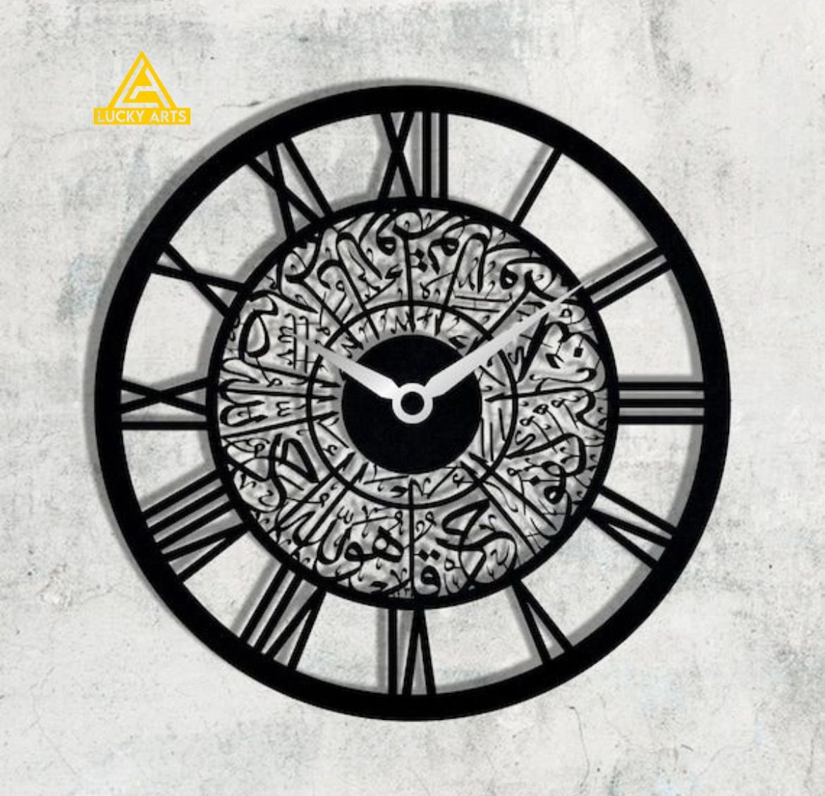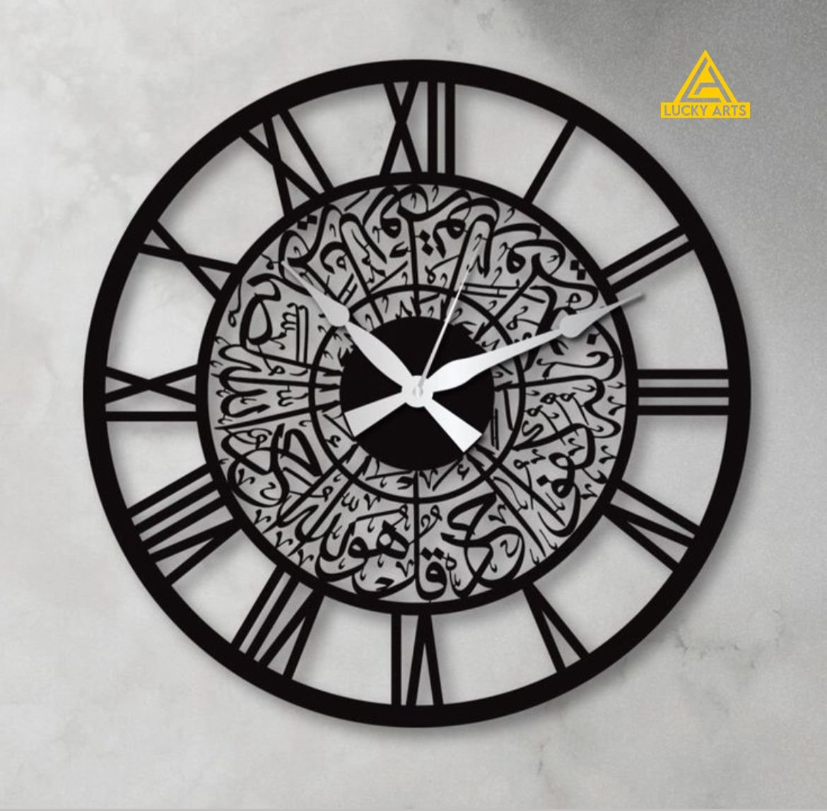 An Islamic Wall Clock featuring Surah Al-Ikhlas is a unique and spiritually inspired timepiece that blends practical utility with Islamic art and values. This decorative clock not only helps you keep track of time but also serves as a constant reminder of Tawheed (the Oneness of Allah) through the revered Surah Al-Ikhlas from the Holy Quran.
